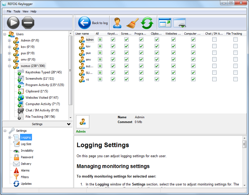REFOG Keylogger has everything that's in the Free Keylogger Software, and adds the Complete Invisibility mode. Being able to run silently and undetectable, REFOG Keylogger is impossible to be seen or removed by your teenage kids or the spouse.